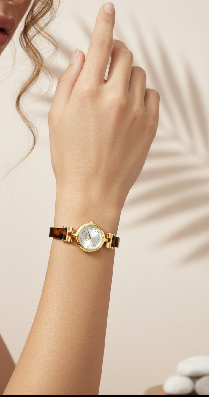 Crafted with a clean, compact silhouette and powered by dependable quartz movement, this timepiece delivers accuracy while maintaining a lightweight and comfortable feel on the wrist. Its alloy construction enhances durability while keeping the design polished and sophisticated.